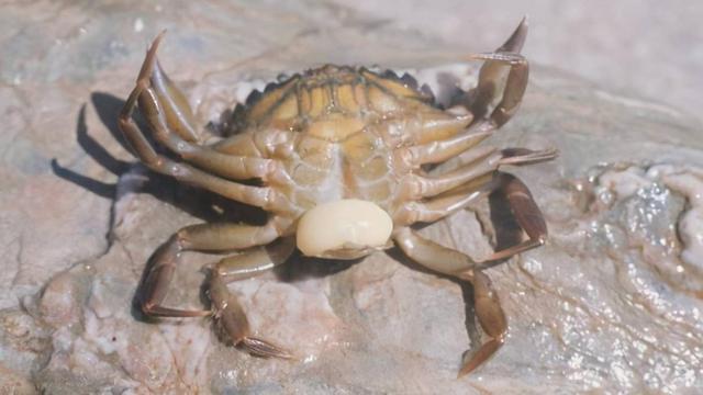 而且更神奇的是,当另一只雄性蟹奴的幼虫找到这只被寄生的“雌化”雄蟹时,会被它吸引,注入精子,完成蟹奴的受精。而这只被变性的雄蟹,会像一个尽职尽责的母亲一样,保护这些卵,清理附着在卵上的杂物,甚至爬到高处的岩石上,用腹部搅动水流,帮助蟹奴的幼体扩散到更远的地方。